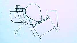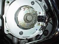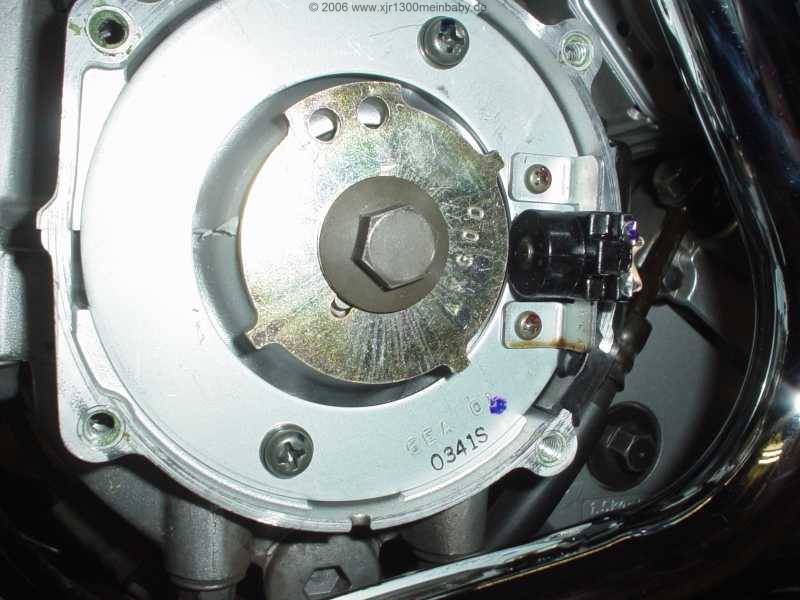 Die Kubelwelle gegen den Uhrzeigersinn drehen. Wenn der Kolben in Zylinder Nr.1 den oberen Totpunkt (OT) im Verdichtungshub erreicht, steht die OT - Markierung der Impulsgeberscheibe an der Markierung der Halterung der Impulsaufnahmespule. (bei OT - Stellung im Verdichtungshub zeigen die Nocken von Ein- und Auslaßnockenwelle in entgegengesetzte Richtung)