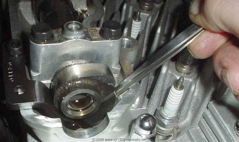 Die Nockenwelle langsam drehen, bis der maximale Ventilhub resultiert. Jetzt kann das Einstellwerkzeug eingeführ werden. (dabei sicherstellen, daß das Einstellwerkzeug nur den Ventilstößel und nicht das Ventilplättchen berührt)