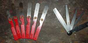 Um die Messung des Ventilspiels genau durchführen zu können benötigt man geeignete Fühlerlehren. Bei den in Baumärkten angebotenen Lehren sind die Maßsprünge von 0,5mm zu groß. Die links im Bild gezeigten Lehren mit Maßsprüngen von 0,1mm hat mein Händler für mich besorgt.(Stückpreis 2,20€) Die Lehren sollten also mind. den Meßbereich von 0,10mm bis 0,20mm lückenlos abdecken.